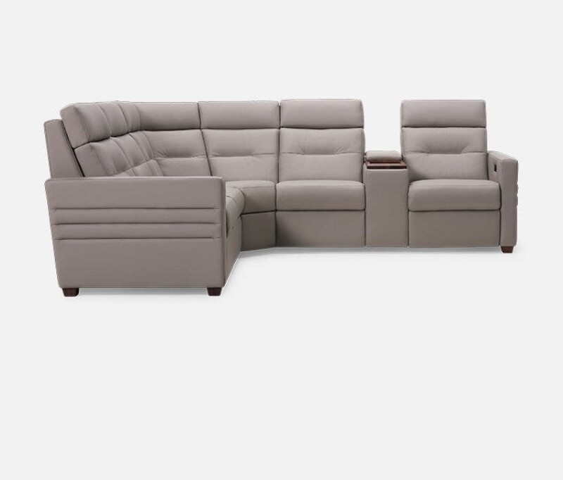 Reece begins with a transitional narrow track arm with heavily padded inside and outside panels. The outside arm panels have been further enhanced with two horizontal channels. The seat and backs mirror the track arm with box border styling and the backs include a decorative pull tuck detail and sits atop tapered solid walnut block legs. Reece comes standard with triple motor functionality; power footrest, power headrest and power lumbar. Please note the Palliser Recline app is required to access full recline functionality and additional premium features on armless pieces.