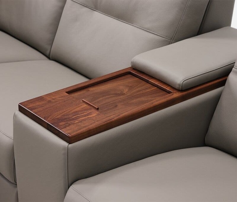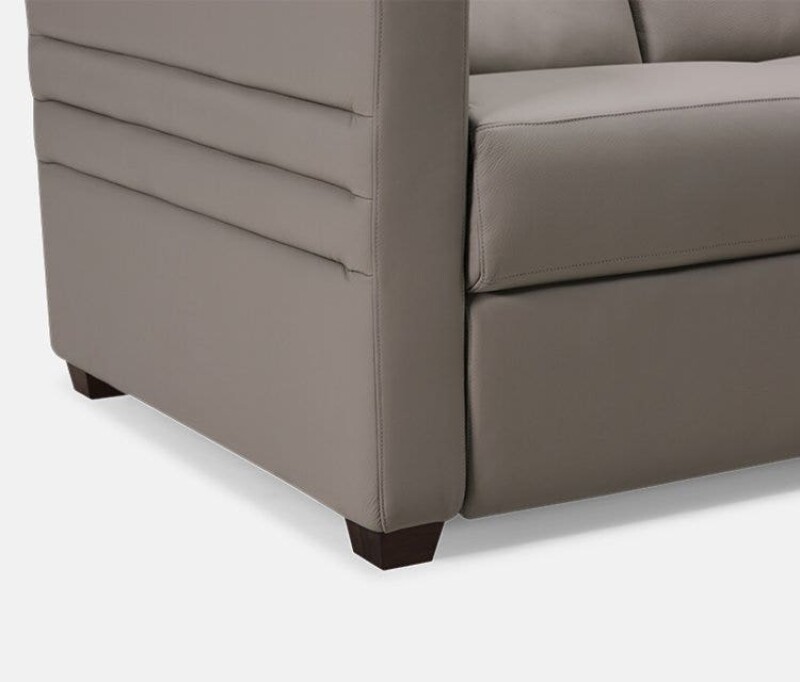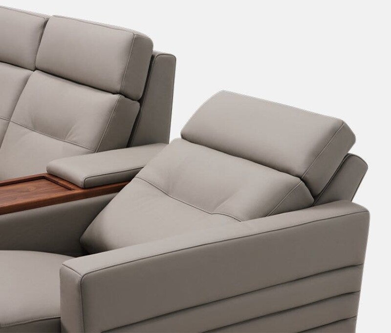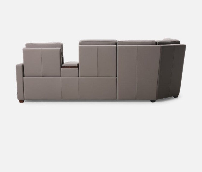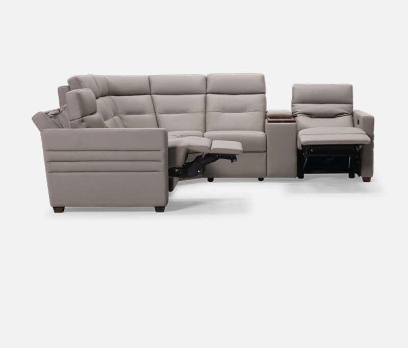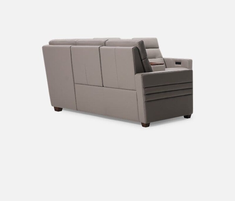 Reece begins with a transitional narrow track arm with heavily padded inside and outside panels. The outside arm panels have been further enhanced with two horizontal channels. The seat and backs mirror the track arm with box border styling and the backs include a decorative pull tuck detail and sits atop tapered solid walnut block legs. Reece comes standard with triple motor functionality; power footrest, power headrest and power lumbar. Please note the Palliser Recline app is required to access full recline functionality and additional premium features on armless pieces.