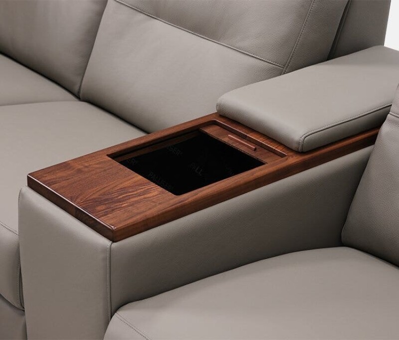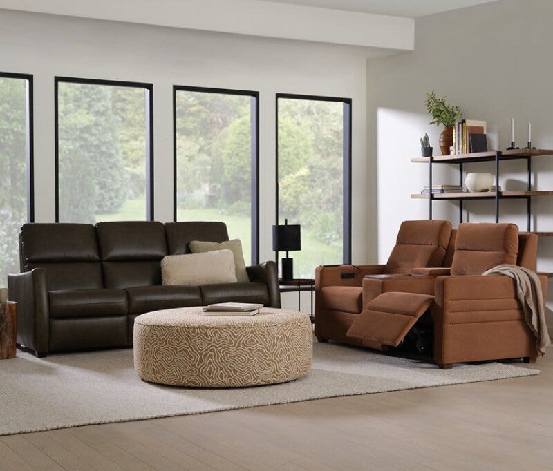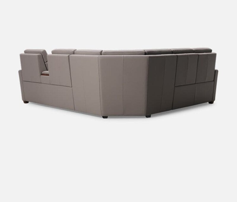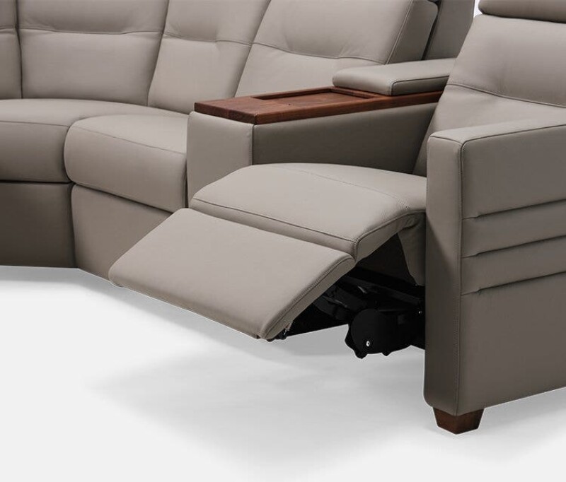 Reece begins with a transitional narrow track arm with heavily padded inside and outside panels. The outside arm panels have been further enhanced with two horizontal channels. The seat and backs mirror the track arm with box border styling and the backs include a decorative pull tuck detail and sits atop tapered solid walnut block legs. Reece comes standard with triple motor functionality; power footrest, power headrest and power lumbar. Please note the Palliser Recline app is required to access full recline functionality and additional premium features on armless pieces.