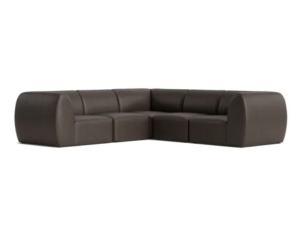 Leather modular sofa with a deep, relaxed seat and elegantly curved back and arms. Tight upholstery and low wood legs; 119 in. W x 40 in. D x 31 in. H.