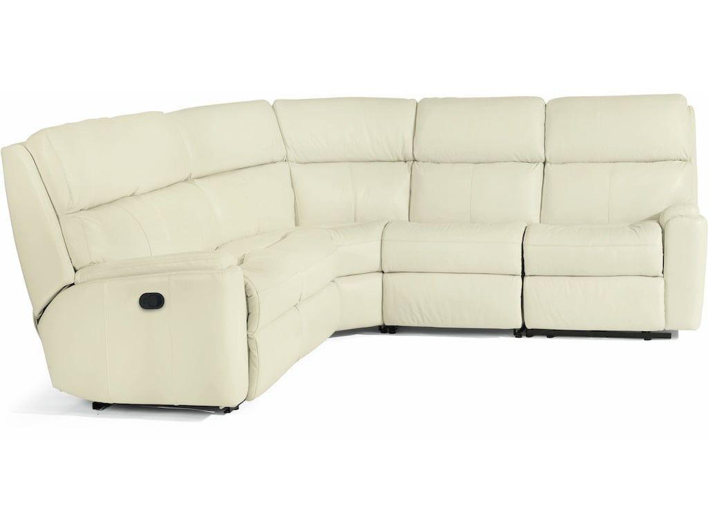 Relax and enjoy the luxurious feel of the Rio Reclining Sectional, upholstered in premium leather. The entire family will love the divided back cushions which support your neck, back and lower lumbar as you unwind. Adjust the recline with easy-to-access parachute releases in both arms, and keep beverages and remotes close at hand with the convenient storage console. Design details including inset padded armrests have a refined look and provide additional forearm support. You can enjoy this firm yet flexible sitting experience thanks to our patented Flexsteel DualFlex Spring Systemâ„¢, which ensures the sectional will last for years to come. Make Rio your own by choosing from over 50 premium leather options to suit your style.
