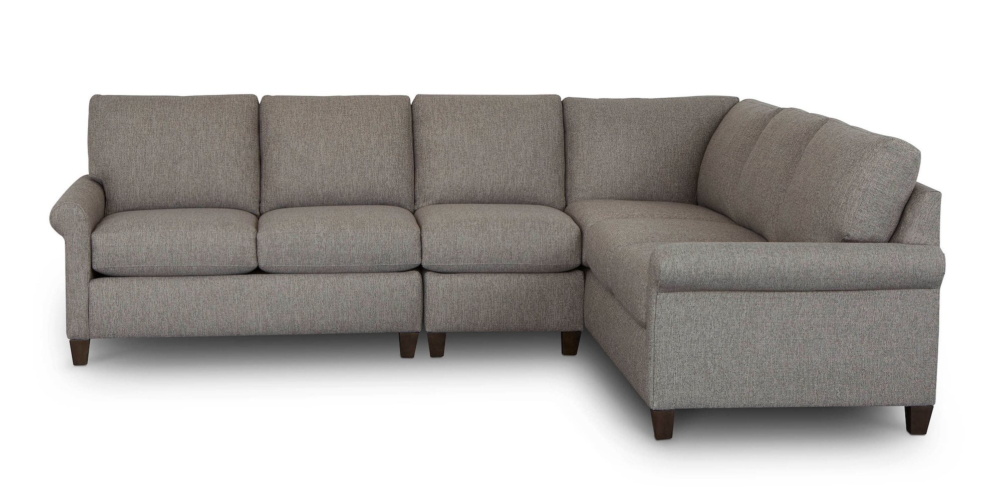 Spencer features a small scaled rolled arm for the perfect combination of seating comfort and liveable style. Spencer has attached back pillows and offers sectional and sofa seating configurations. Standard finish on the legs is brindle.