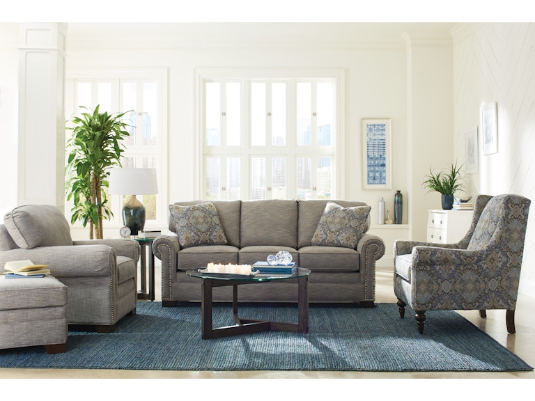 Casual sophistication comes to life in this updated classic sofa. Dark brass nail heads trim the arm panels and accent the pleated rolled arms- set at the perfect height for a good nap! Three seat cushions and three attached backs provide a plush, comfortable place to relax. Tapered block legs offer a modern touch to this simple, but refined look. Also available are the matching sleeper, loveseat, chair and ottoman. Optional nail finishes available. Also available without nail head trim.