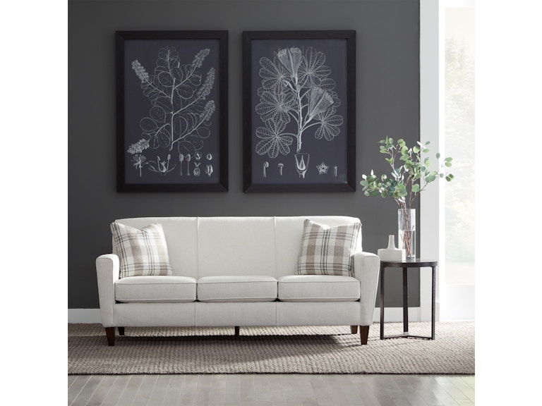 Clean lines and refined tailoring make the Abbey sofa a statement in the home. This smaller scaled design is perfect for smaller areas, yet its tight padded back style provides the roominess of a full sized sofa. Tall tapered legs positioned directly under the slim tapered track arms add visual height, and the tight back enhances its architectural feel. Upholstered in an ivory colored performance fabric with two trendy plaid accent pillows, Abbey is the perfect sofa for everyday use by active families.