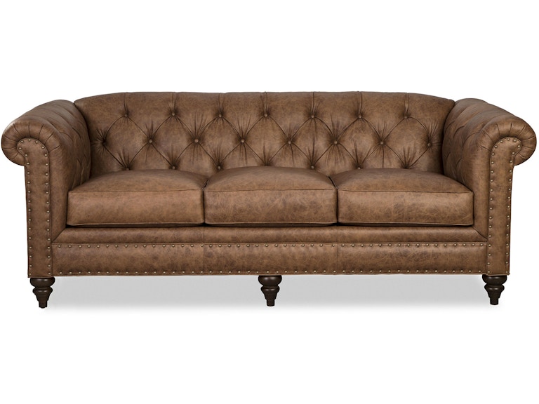 Casual luxury, European styling, and vintage touches meld together to bring a modern update to this classic leather Chesterfield sofa. It features handcrafted elements like the tall turned legs and nail head trim around the arm panels and front rail.
