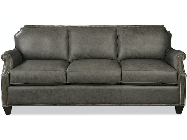 This tailored leather sofa is one of our most stylish. Designed to bridge the gap between traditional and modern, it blends elements of both. It features 3 plush Blend Down Coil seats, 3 semi-attached back pillows with box border edging, and transitional tapered legs. But the real heart of this style is in the nail head trim. It frames the elegant curvature of the arm panels and defines the front rail edge. It also makes an appearance around the back, where it dips and turns with the handsome clipped corners. This is a piece to bring you years of enjoyment and comfort. Matching loveseat, chair and ottoman available as well. Optional nail finishes available.