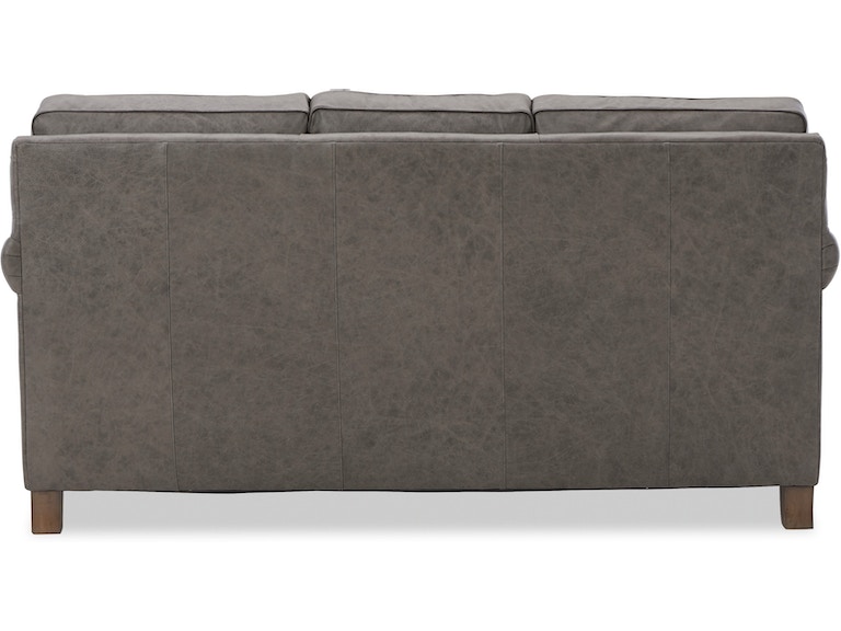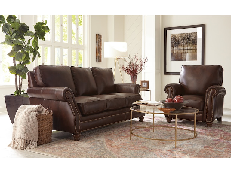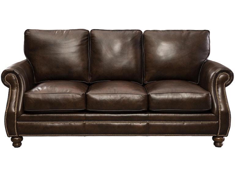 A beautifully tailored, classic leather sofa featuring Blend Down Coil cushions and nail head trim. Take note of the elegant Bombay shaping in the arms, beautiful turned legs and attached box border back pillows. Optional nail finishes available. Matching loveseat, chair and ottoman available as well.