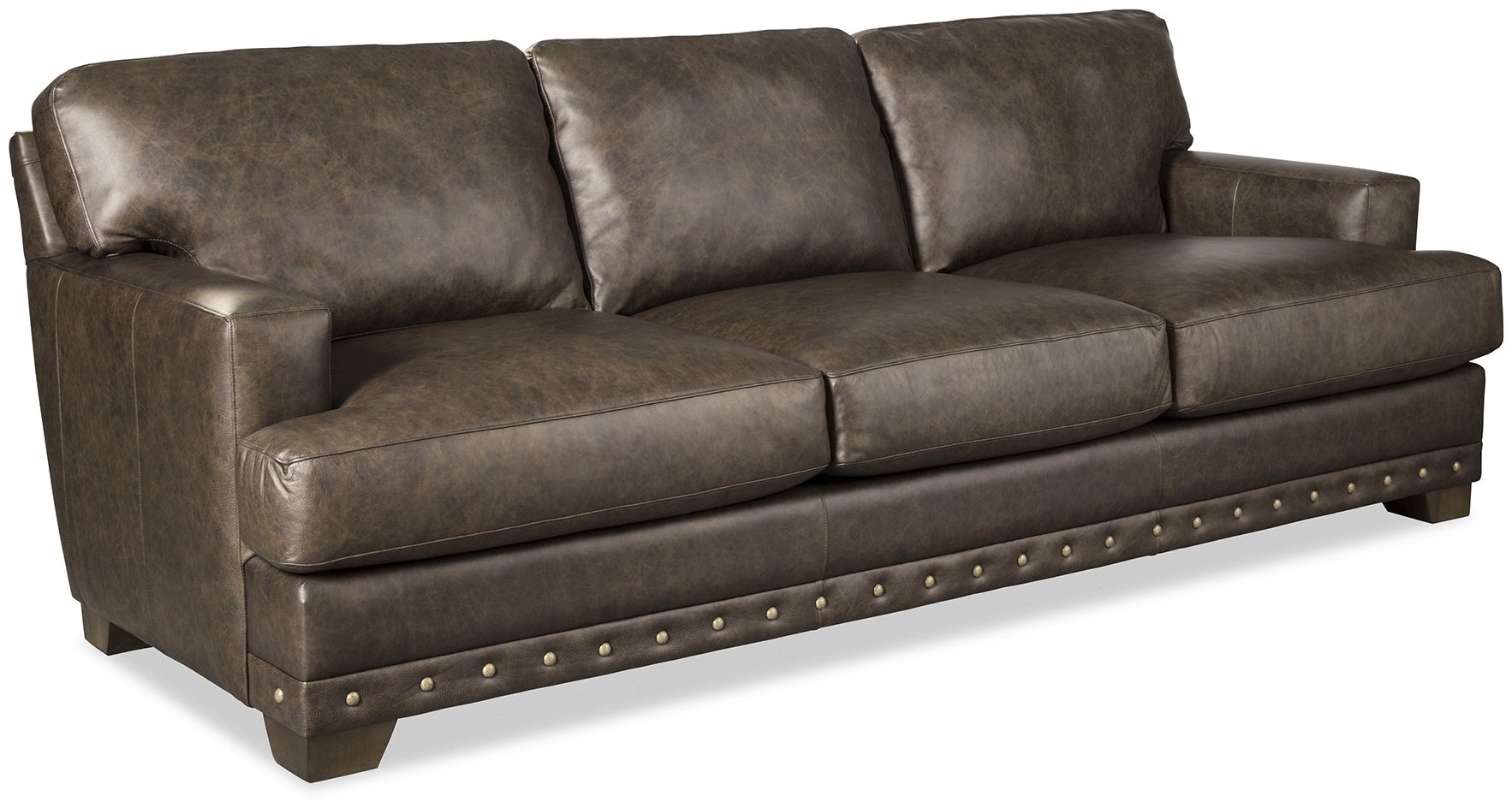 With architectural shaping and bold nail head detailing, this leather sofa has a casual appeal as well as amazing comfort. Deep seated, and generously scaled at 100”, there is plenty of room to relax. It features semi-attached backs, Blend Down Coil cushions, and track arms. Also available are the matching loveseat, chair 1/2 and ottoman. Also available without nail head trim.