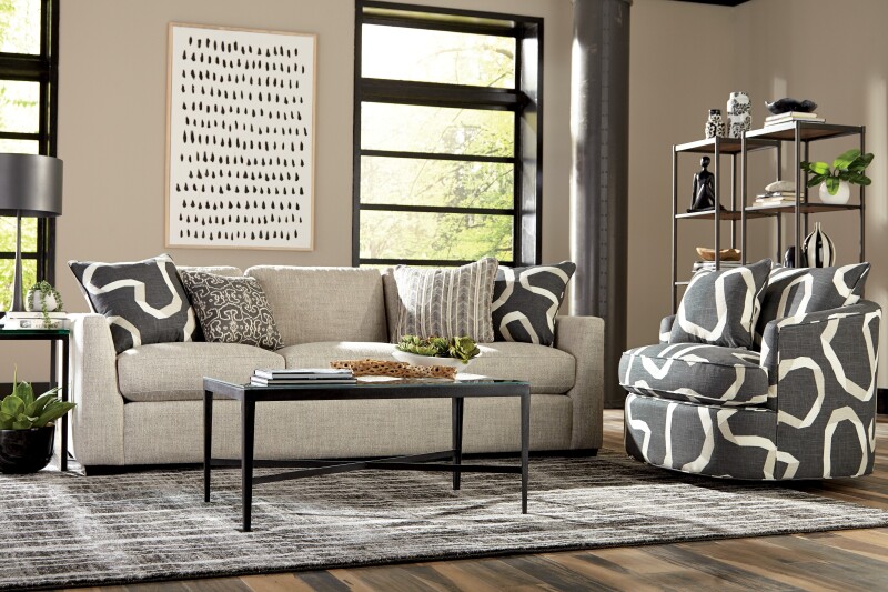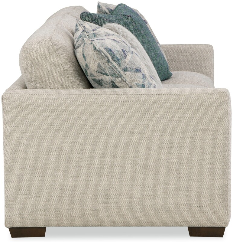 This casual modern sofa features architectural shaping and low, deep seating, designed to be both comfortable and on-trend. It’s generous scale and Blend Down Cloud cushioning provide plush, seating for the whole family. French seaming, loose box border back pillows, and 4 accent pillows. Also available are the matching loveseat, chair 1/2, ottoman and sectional.
