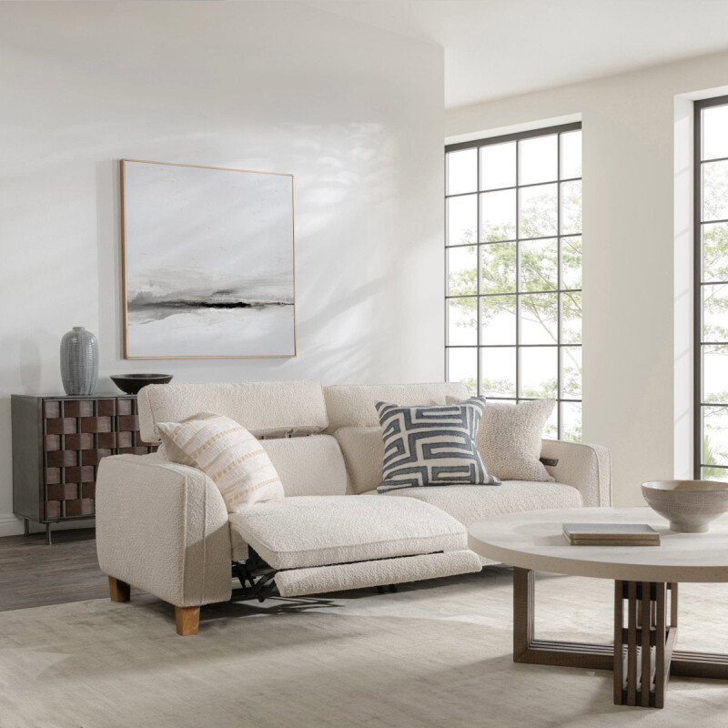 Unwind effortlessly with the Conway Power Recliner Sofa. Wrapped in soft polyester fabric and anchored by sturdy ash wood accents, it blends contemporary design with exceptional comfort. The dual power reclines feature lets you find your perfect lounging position, while the plush cushioning invites relaxation. Available in Brown and Ivory.