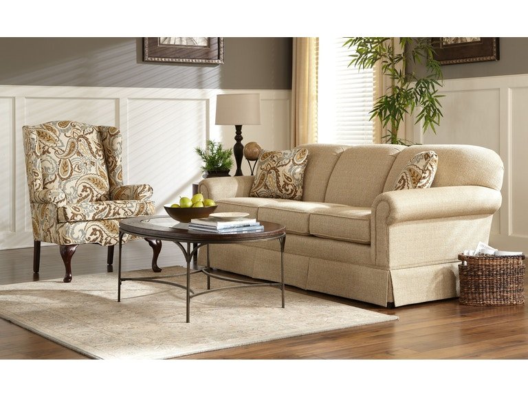 One of our most popular traditional styles, this 3 seat sofa features a tailored pleated skirt and rolled paneled arms. A tight back keeps this style looking neat and pulled together all the time. Also available as a sleeper. Matching loveseat, chair and ottoman available as well.