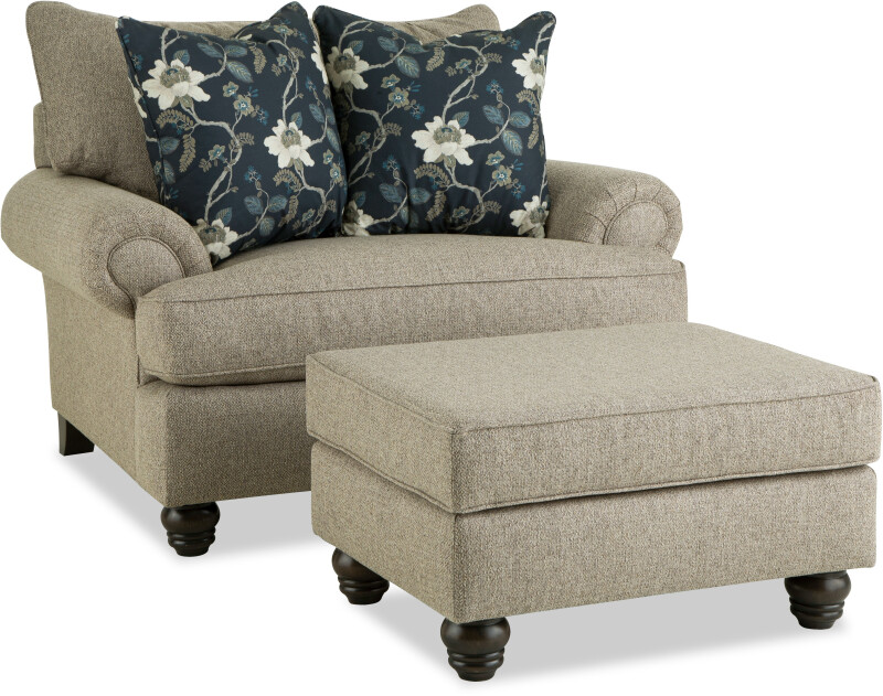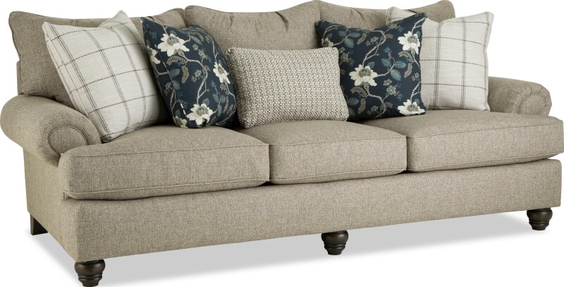 One of our all-time best sellers, this sofa has lots of style and at 100” in length, it has room for the whole family! It features 3-seats, 3 loose pillow backs, and 5 accent pillows, along with turned legs and a set-back paneled roll arm. But the comfort is what will win you over- deep and plush, this sofa uses our premium cushion and backs to give you a perfect place for relaxing at home. Matching loveseat, chair and ottoman available as well as 88” length sofa (style 7972) and matching sectional.