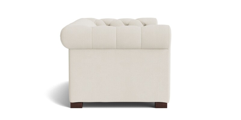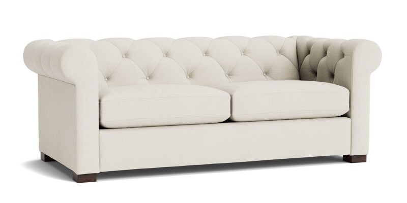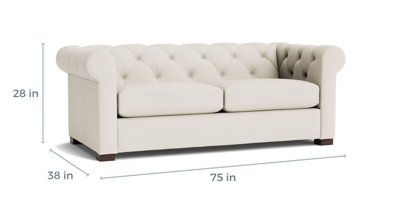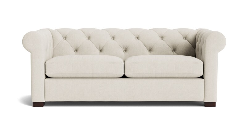 Chesterfield‑style fabric loveseat with deep seats and clean lines, sized to anchor smaller rooms. Available in a wide range of in‑store fabric colors and textures.