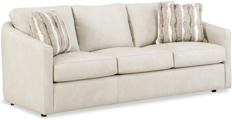 Make a statement with this chic and curvy style from our CM Leather collection. It features a high sloping track arm that wraps into a beautiful curve around the back, catching your eye from every angle. French seamed all over to give a clean and modern aesthetic, this piece has attached box border back pillows and plush Blend Down Coil seat cushioning. This style is standard with one pair of Blend Down toss pillows in your choice of fabric. Also available are the matching loveseat, chair, swivel chair, and ottoman.