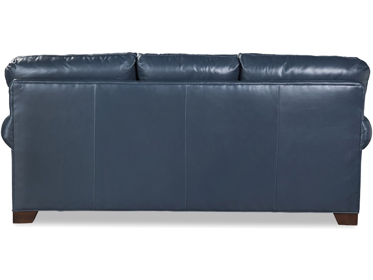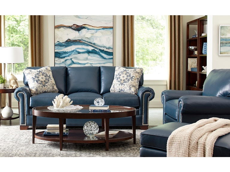 Casual sophistication comes to life in this updated classic leather sofa. Nail heads trim the arm panels and accent the pleated rolled arms- set at the perfect height for a good nap! Three plush Blend Down Coil seat cushions and three attached backs provide a plush, comfortable place to relax. Tapered block legs offer a modern touch to this simple, but refined look. Also available are the matching loveseat, chair and ottoman. Optional nail finishes available. This style is standard with one pair of Blend Down toss pillows in your choice of fabric. Also available without nail head trim.