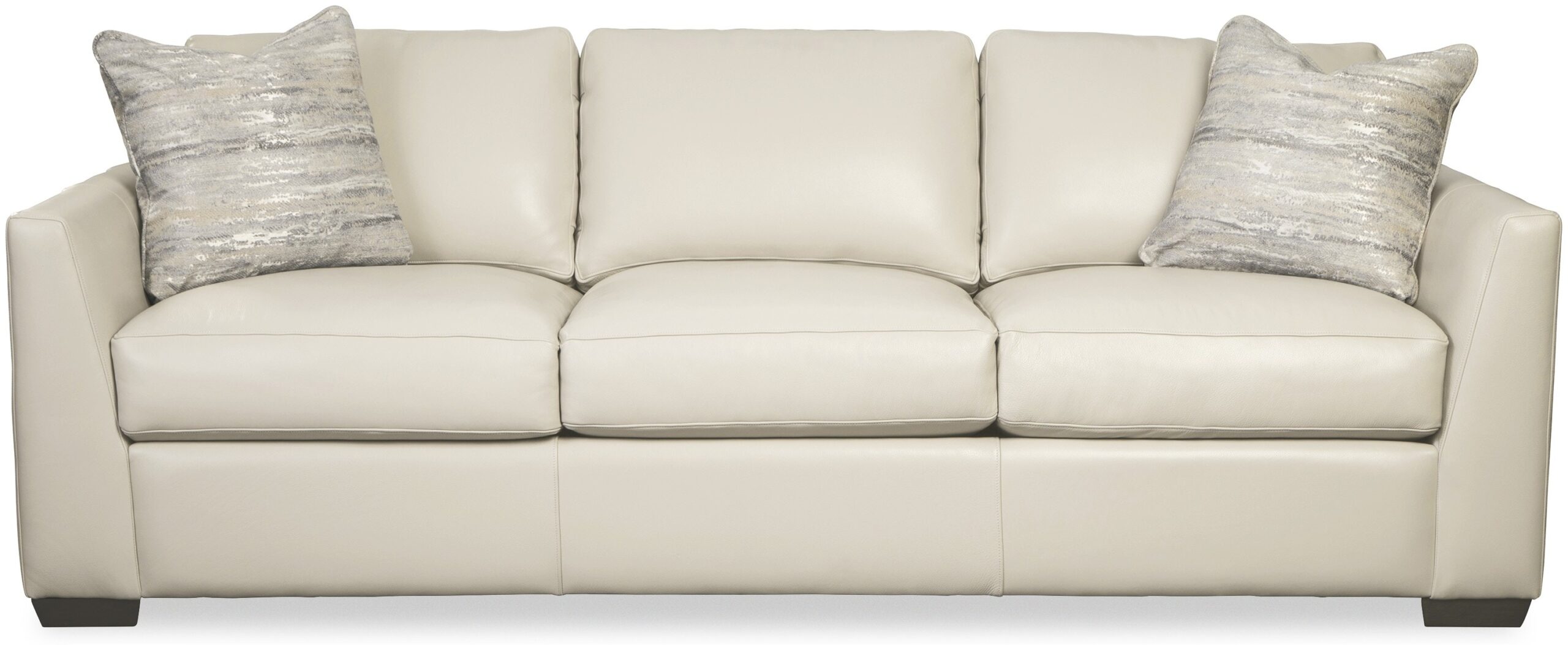 This modern leather sofa features architectural shaping and low, deep seating, designed to be both comfortable and on-trend. It’s generous scale and Blend Down Coil cushioning provide plush, seating for the whole family. French seaming, semi-attached box border back pillows, and low block legs. Also available are the matching loveseat, chair 1/2, and ottoman. This style is standard with one pair of Blend Down toss pillows in your choice of fabric.