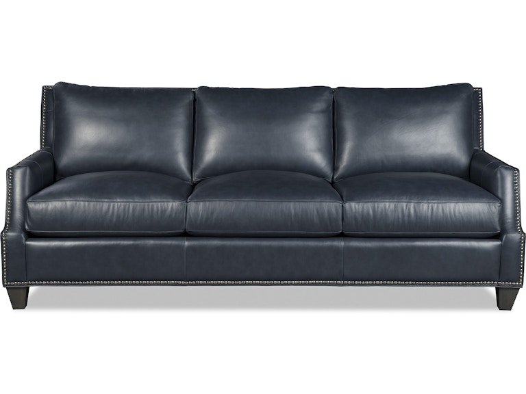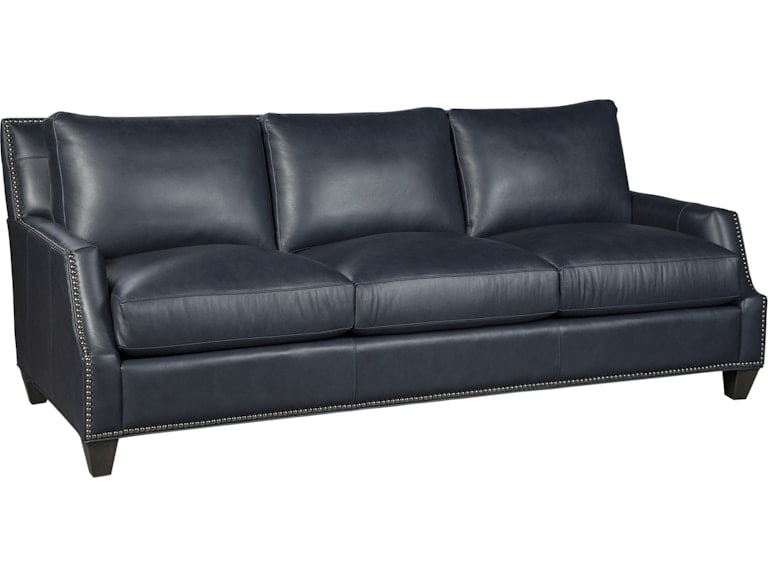 Transitional styling allows this leather sofa to feel at home in both traditional or modern settings. Nail head trim frames the top and bottom rails and accents the dramatic shape of the arms. Tapered legs further enhance the clean look. With attached back pillows and Blend-Down Coil seat cushions, you won’t believe the comfort! Optional nail finishes available. Also available are the matching loveseat, chair, and ottoman. Also available without nail head trim.