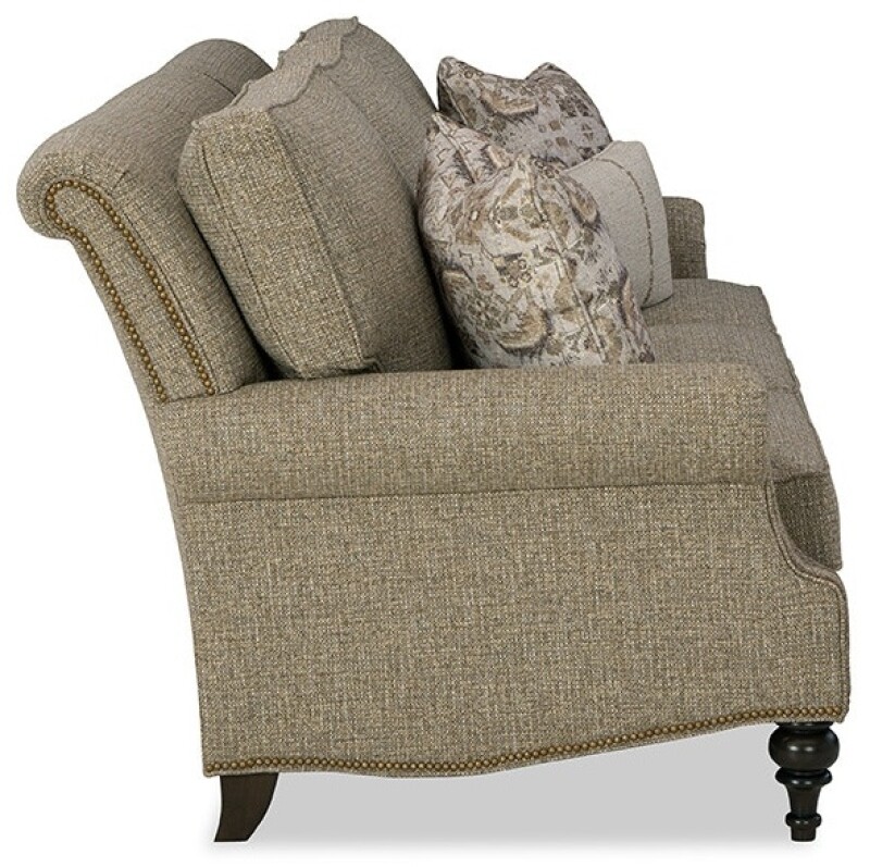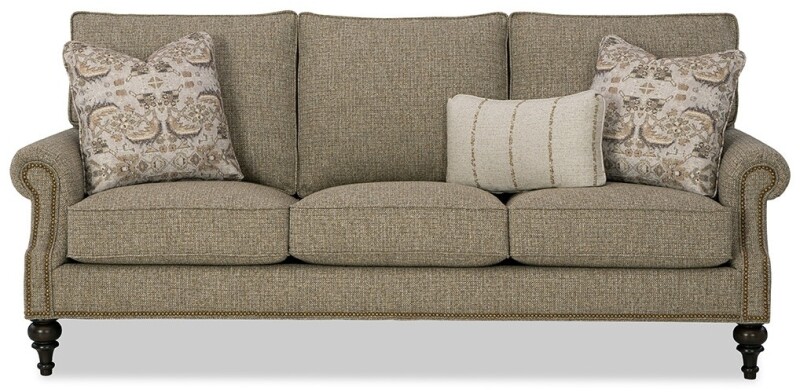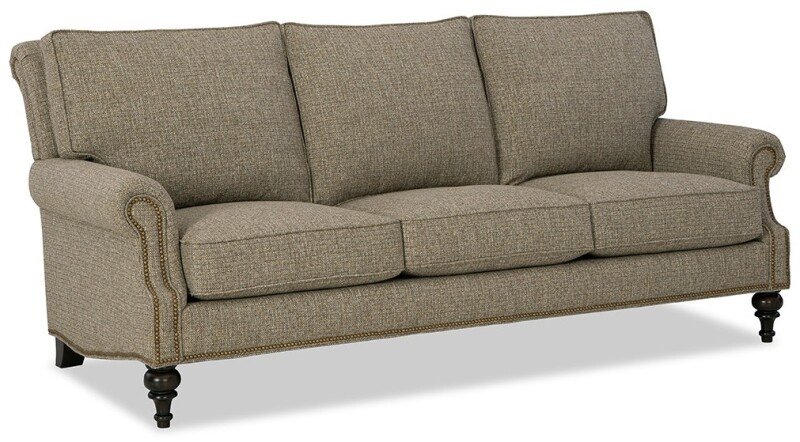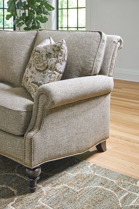 Classic traditional details and nail head trim accents are the things you’ll notice first on this gracefully finessed sofa. It features a rollover back, cut-back rolled arms, and beautifully turned legs that offer a familiar heirloom touch. Attached box border back pillows. Optional nail finishes available. Also available is the matching loveseat, chair 1/2, and ottoman. Also available without nail head trim.