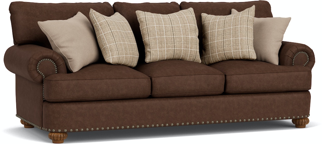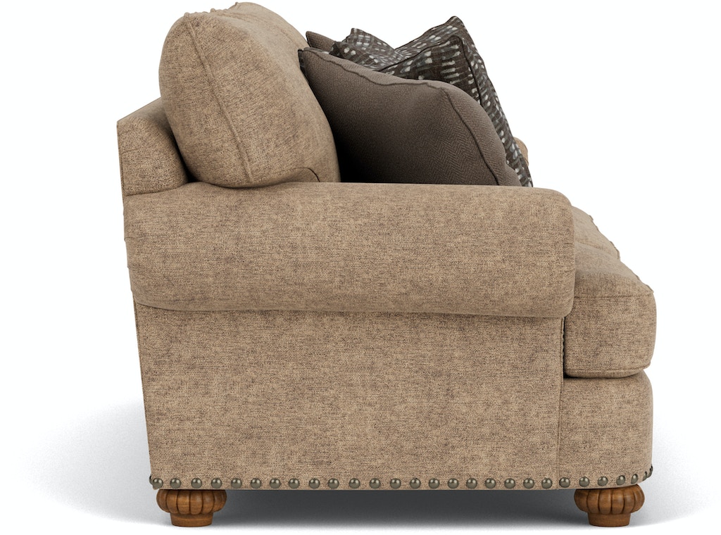 Prominently rolled arms and a padded front rail give Patterson its welcoming appearance. Overstuffed seat and back cushions on a large frame make it difficult to resist curling up on this piece. Fluted bun feet and optional nailhead trim add the finishing touches to Patterson. Width: 96″ Depth: 42″ Height: 40″