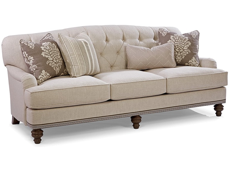 Subtle sophistication and exceptional detail are the things you’ll notice immediately when you come across this beautiful piece from the Paula Deen Home collection. Along with the graceful curves along the top rail, the classic Charles of London arm and tufted back work in harmony to create a welcoming, casual look that invites you to settle in for a while. Featuring a smart cotton ribbon trim along the front rail, exquisite turned legs, and four accent pillows, this piece also incorporates Paula’s premium Down Blend cushions for amazing comfort and durability. Also available are the matching loveseat, chair 1/2, and ottoman.