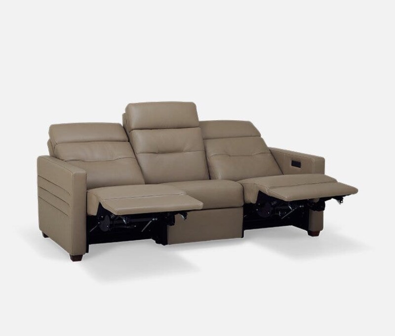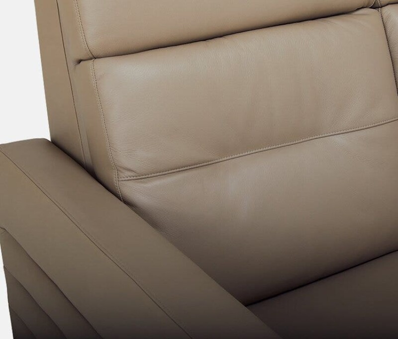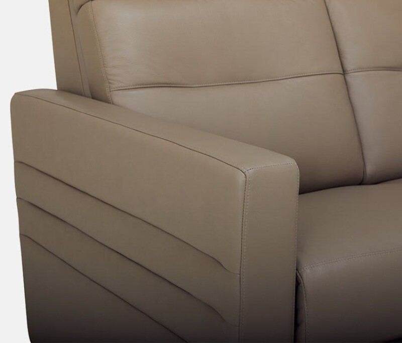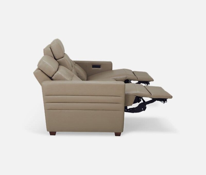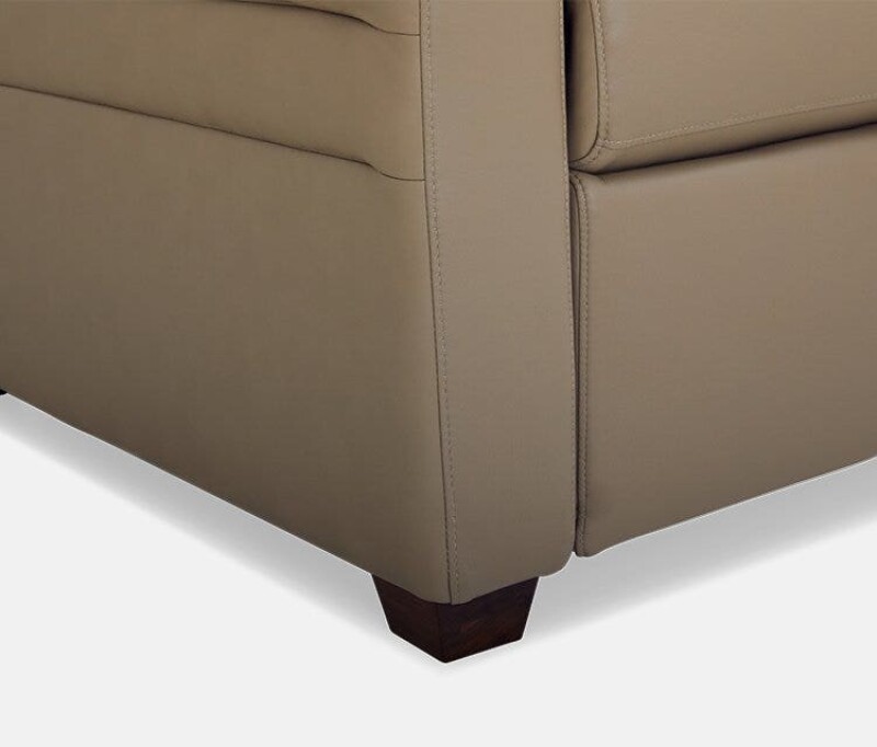 Reece begins with a transitional narrow track arm with heavily padded inside and outside panels. The outside arm panels have been further enhanced with two horizontal channels. The seat and backs mirror the track arm with box border styling and the backs include a decorative pull tuck detail and sits atop tapered solid walnut block legs. Reece comes standard with triple motor functionality; power footrest, power headrest and power lumbar. Please note the Palliser Recline app is required to access full recline functionality and additional premium features on armless pieces.