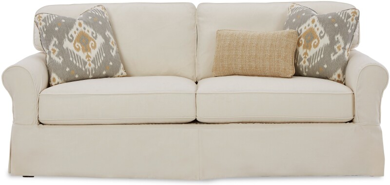 Tradition and Today blend together seamlessly in this classic sofa featuring a true, removable slipcover that fits snugly, with Velcro attachments in key areas. It can be ordered in any of our fabrics (including a few that are machine washable!) It features loose box border backs and plush Super Soft seat cushions for extraordinary comfort, as well as two Blend Down toss pillows and one kidney pillow for a welcoming touch. Sock arms and a relaxed waterfall skirt compete the familiar look of this casual and versatile sofa. You will love coming home to this fresh and inviting look. Also available as a queen sleeper. Also available as a 3 seat style using style number 917450SS or a smaller 80″ 3- seat version using style number 917449SS. Also available – matching loveseat, chair and ottoman. Also available as a sectional.