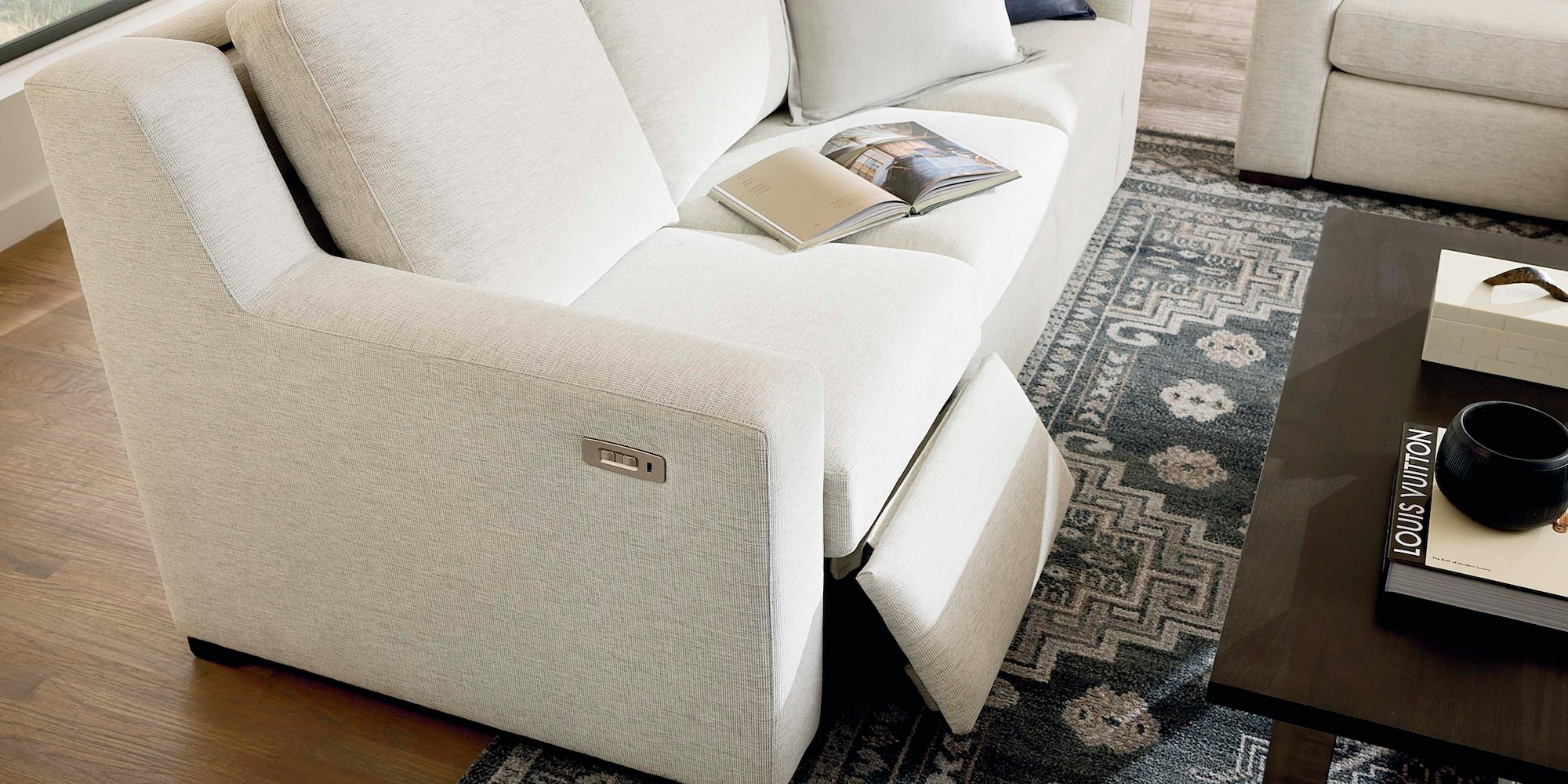 Zero-gravity relaxation never looked so good! Recline in modern style with the Somers reclining sofa, whose casual track arms, removable box back pillows, and wide, low-block legs transform to reclining bliss with the touch of a button. The back pillows can be fluffed and repositioned, while “frame-within-a-frame” construction allows you to place and use a Somers reclining sofa anywhere in your space while still fully accessing its reclining capabilities. Choose from three seat cushion comfort options and a vast range of leather and fabric offerings. You can also opt for a battery pack. Somers puts you on track for the ultimate in personalized style and comfort. Also available as a loveseat.