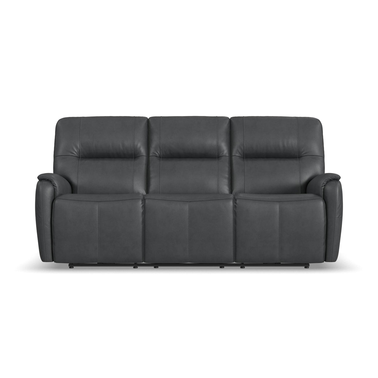 Add a touch of sleek sophistication to your living spaces with the Wilson power reclining sofa. Its thin profile design and subtle curves offer timeless transitional style with an elevated look. The pad-over arms, waterfall chaise and center-divided back provide unmatched support for effortless relaxation, while the power recline and headrest allow for customized comfort. Upholstered in a high-quality, dark thunder gray top grain leather, this sofa features Flexsteel’s patented Blue Steel Springâ„¢ at the heart of each seat, proving unmatched comfort and durability that you can count on.