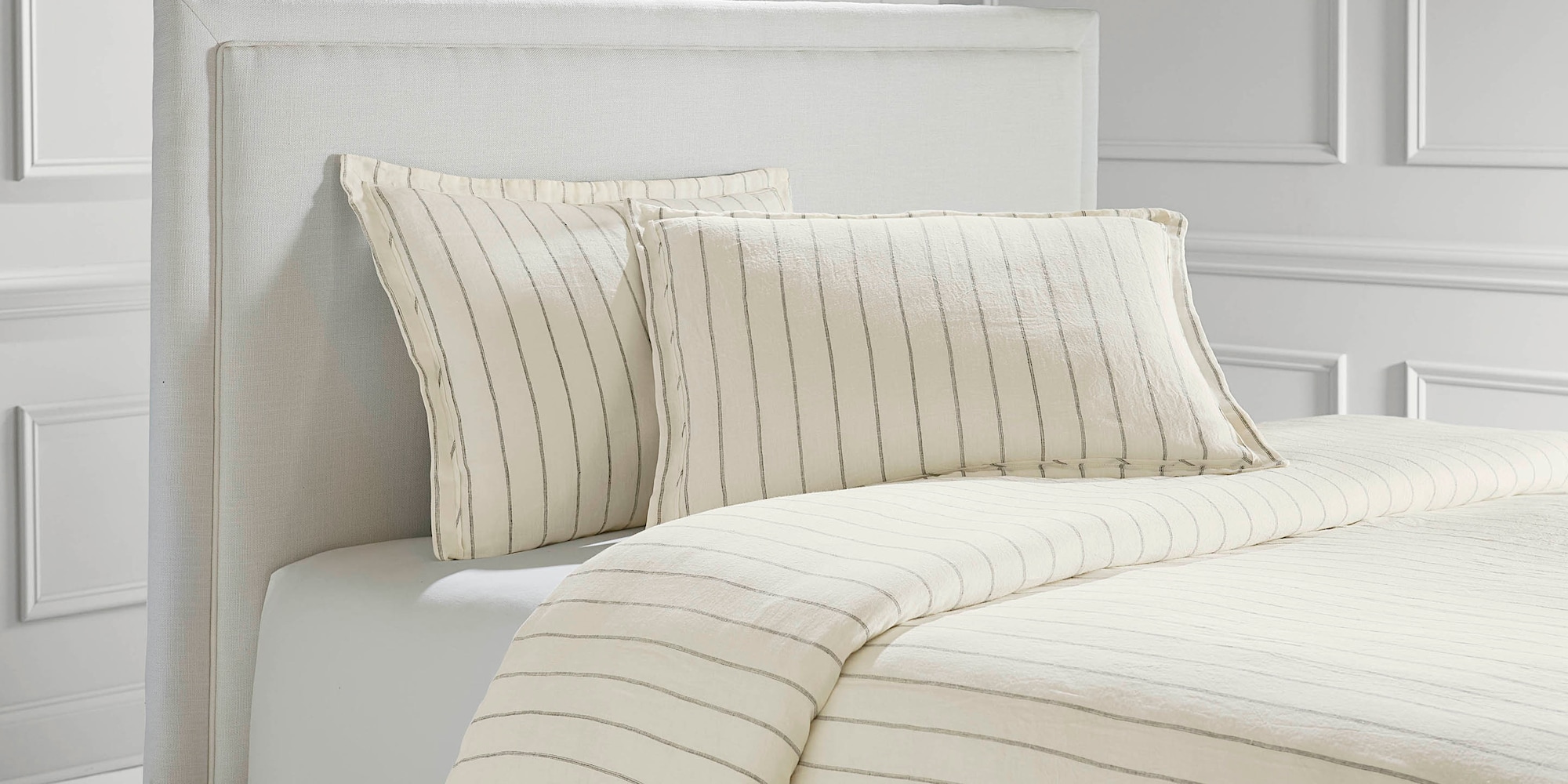 Crisp stripes never go out of style, making Monaco a chic, timeless choice for any bedroom. Ivory-colored linen lends an airy texture, while black woven pinstripes add a subtle pop of drama. Duvet insert is sold separately.