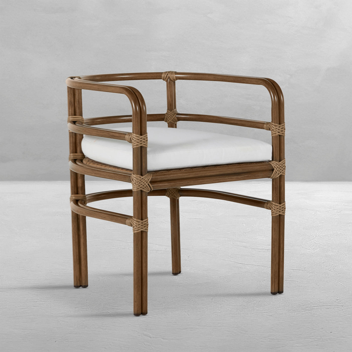 Inspired by the vintage look of natural rattan, the Malibu Arm Chair combines a streamlined design with elegant contours, featuring high-quality wrought aluminum frame and N-Dura™ resin weaving. The oak and burlap-inspired finishes create a stunning visual contrast, while the crossover joints replicate traditional binding work, adding both aesthetic appeal and structural integrity. The Malibu Arm Chair blends comfort and style, providing a touch of coastal elegance to your patio, deck, or outdoor dining venue. This item is designed to be enjoyed either with or without a cushion. Please designate your choice in the below “Select a Cushion” dropdown.