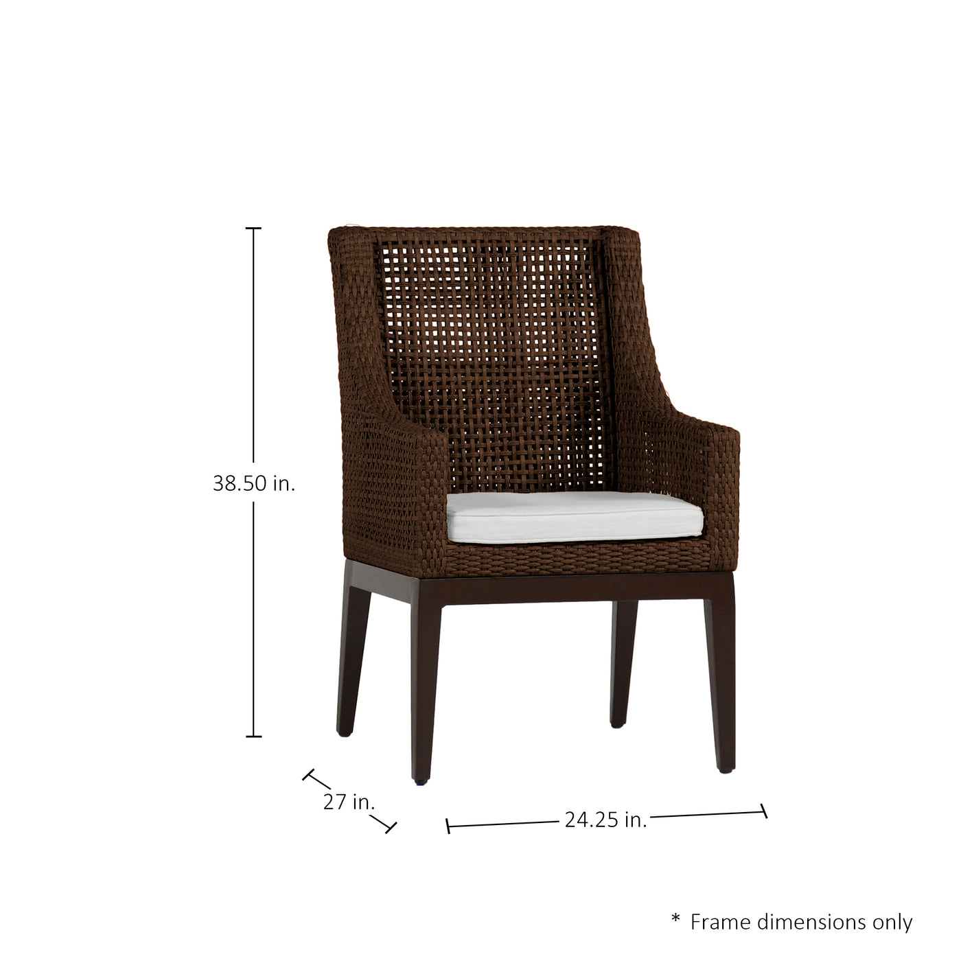 The Peninsula Woven Arm Chair, with its meticulous craftsmanship and sturdy design, offers a touch of timeless elegance. Made from our robust, handwoven N-Dura™ resin wicker, this chair is not only stylish but built to last. Its open weave provides a light and sophisticated look, perfect for creating an inviting outdoor dining area or a standalone statement piece in your garden or on your patio. This chair’s material is engineered for longevity, featuring UV resistance integrated within the wicker to prevent fading and maintain structural integrity. Tested rigorously, the wicker is proven to withstand extensive UV exposure, guaranteeing that the chair retains its beauty for approximately five years of realistic use. This item is designed to be enjoyed either with or without a cushion. Please designate your choice in the below “Select a Cushion” dropdown.