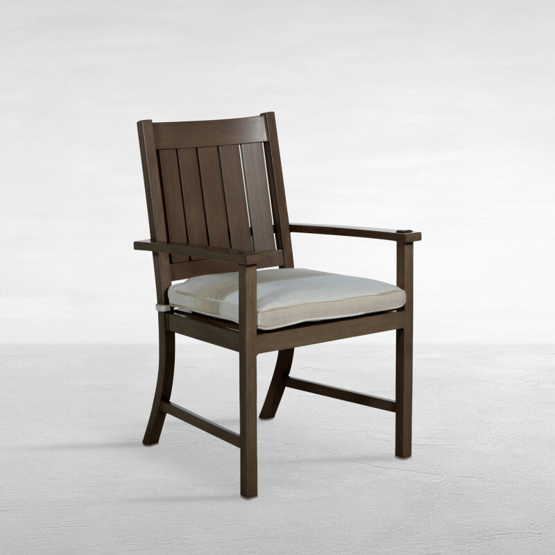 The Croquet Aluminum Arm Chair features a classic style that mixes with an array of outdoor looks. Each piece is meticulously handcrafted from heavyweight wrought aluminum, ensuring both durability and a notable presence in any outdoor space. The furniture boasts a hand-polished shine and seamless 360-degree welds, all encased in an ultra UV-resistant powder-coated finish that promises to withstand the test of time and the elements. The collection is characterized by its graceful proportions, featuring sculpted arms and artistically curved back legs, which highlight the craftsmanship and attention to detail. This item is designed to be enjoyed either with or without a cushion. Designate your choice in the below “Select a Cushion” dropdown. This item is available through our Quick Ship program in the specific frame finish, fabric option, cushion type, and fill shown. Quick Ship pieces are ready to ship within 72 hours, ensuring you receive your selection faster without compromising on quality.