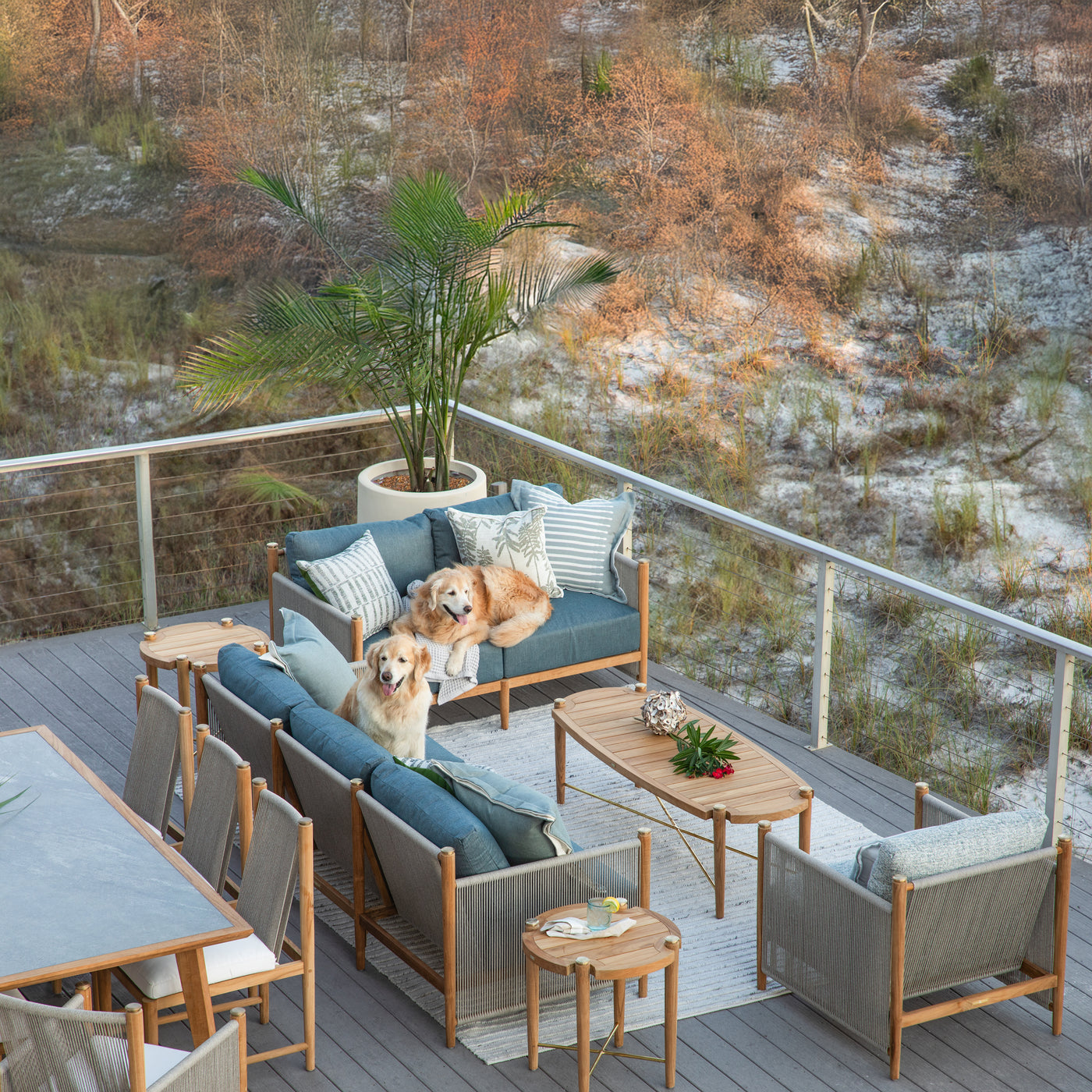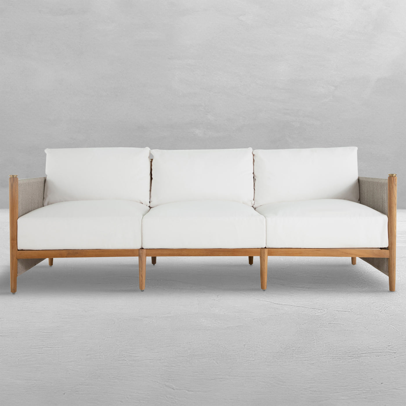 The Pacifica Sofa marries modernity and natural beauty, featuring a teak frame with vertical olefin rope, known for its durability and weather-resistance, and brass toppers destined to patina beautifully. Plush cushions enhance comfort, while the unique rope back offers support and style. This collection, designed for durability promises longevity, weather resistance, and minimal maintenance. Please note, that due to its high-quality center cut, and natural oils, teak will age gracefully without the help of cleaners and protectors.
