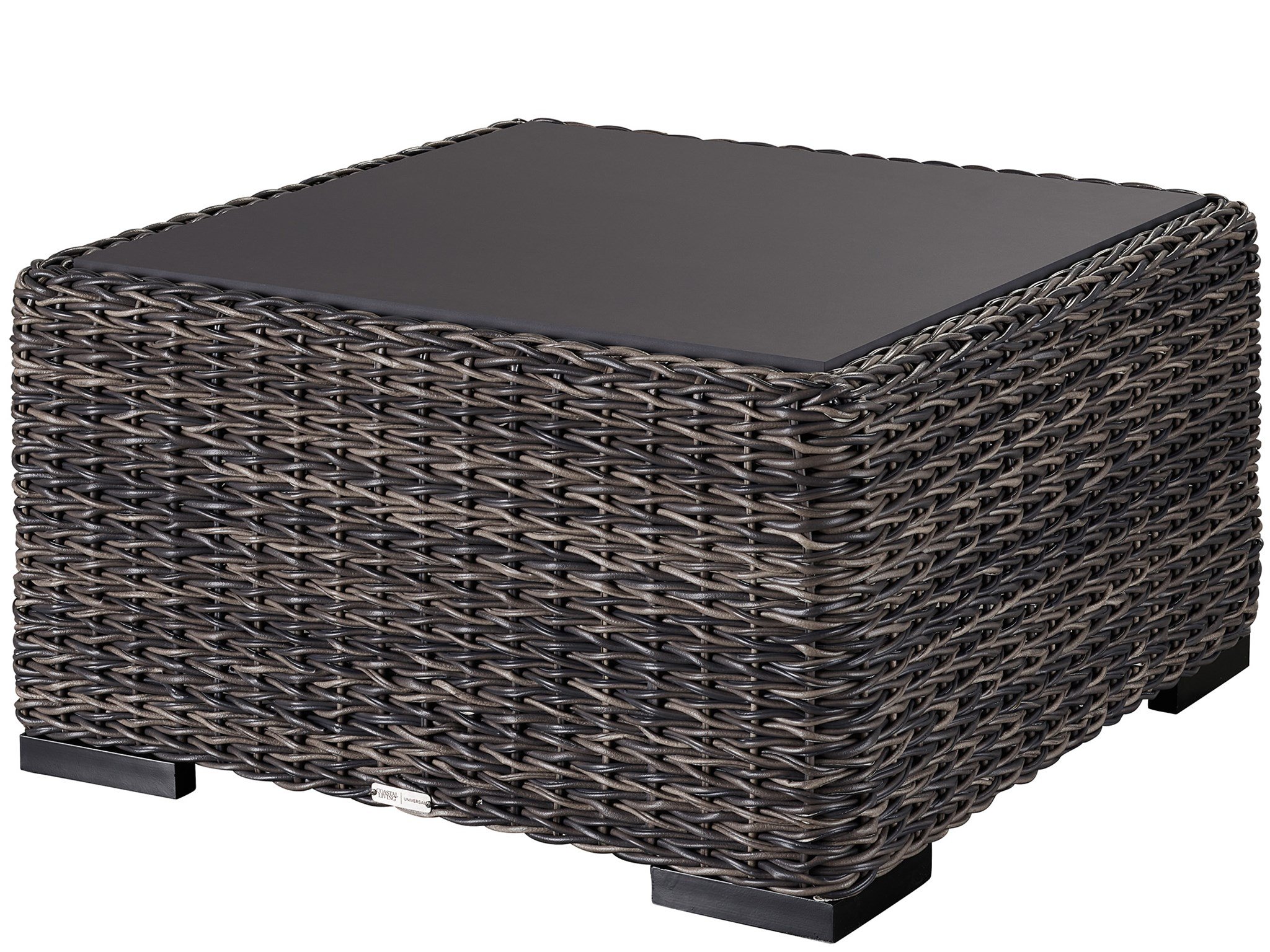 The Montauk Square Cocktail Table offers the best of coastal style paired with outdoor functionality, showcasing a Tawny-finished wicker frame and black composite stone top.