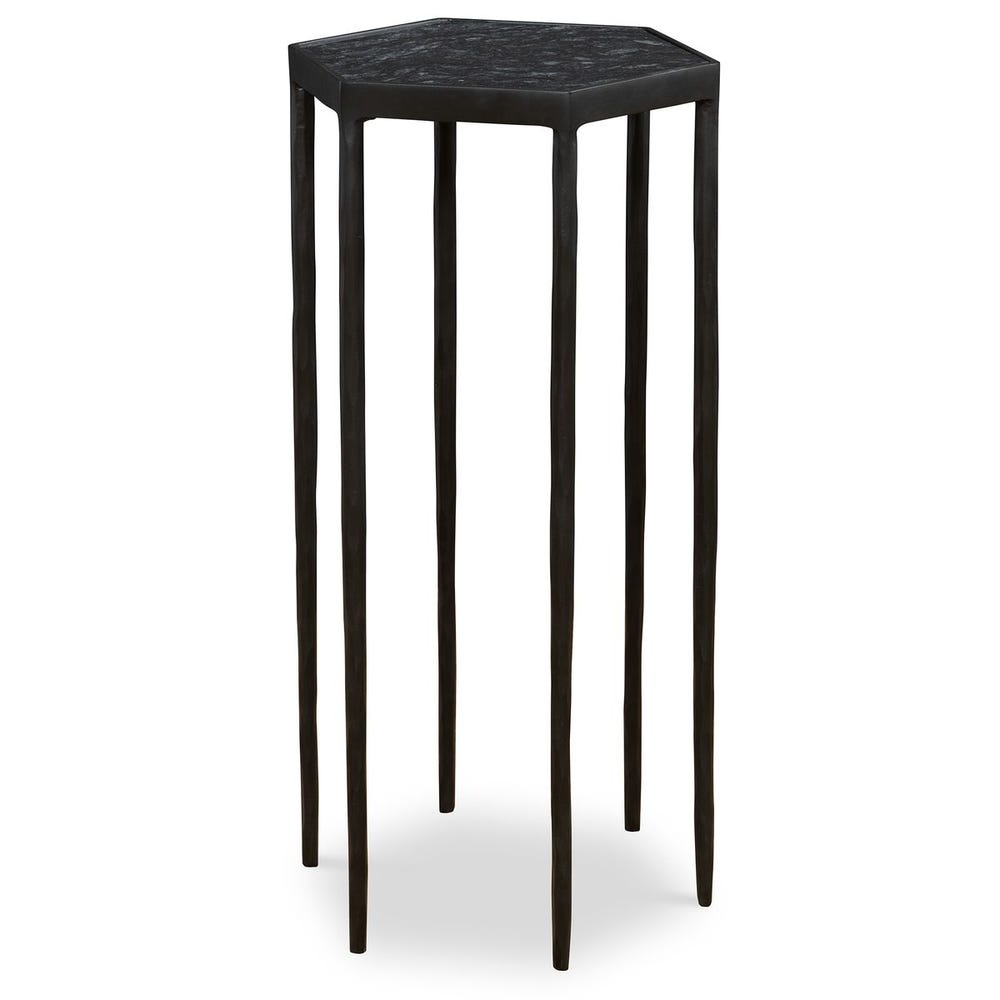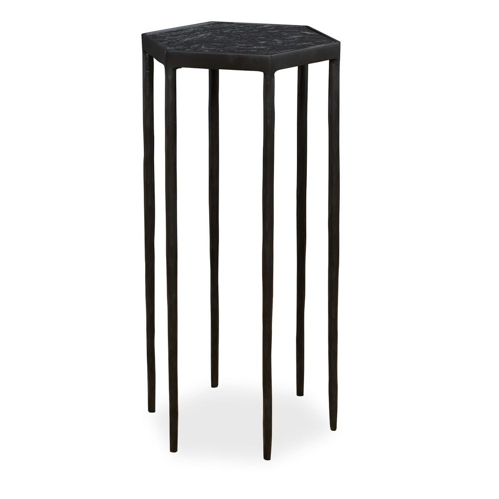 This striking hexagonal table features a chiseled iron base finished in satin black paired with a honed black marble top with natural white veining. Because of the natural characteristics of marble, each piece will have unique veining patterns.