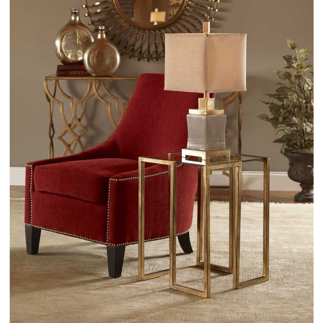 An artful accent table featuring a contemporary forged iron design finished in antique gold leaf with a clear tempered glass top.