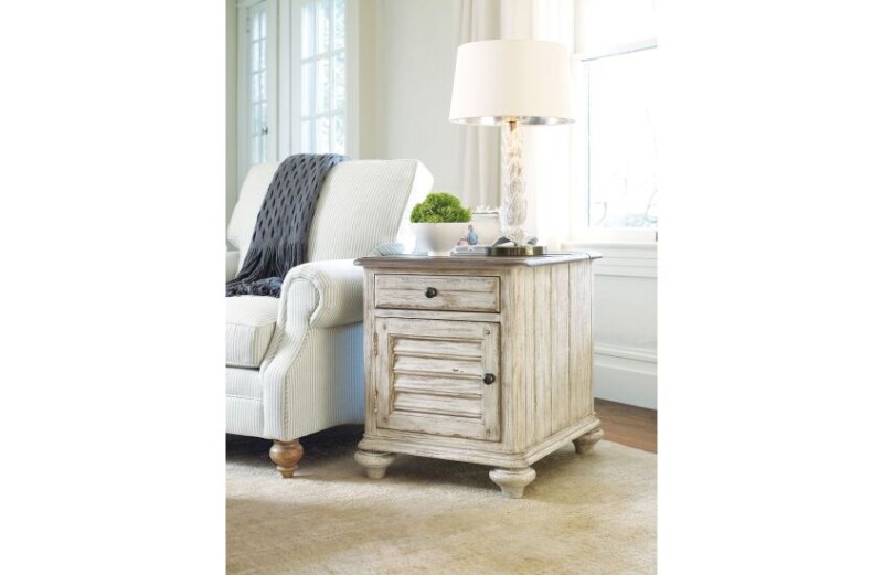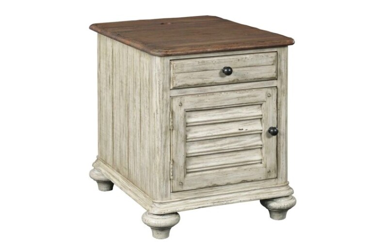 Vintage looks don’t have to miss out on updated function! For this chairside table, we added a electrical power strip and concealed it under a lift top to help manage cords and keep things organized.