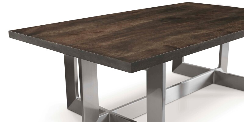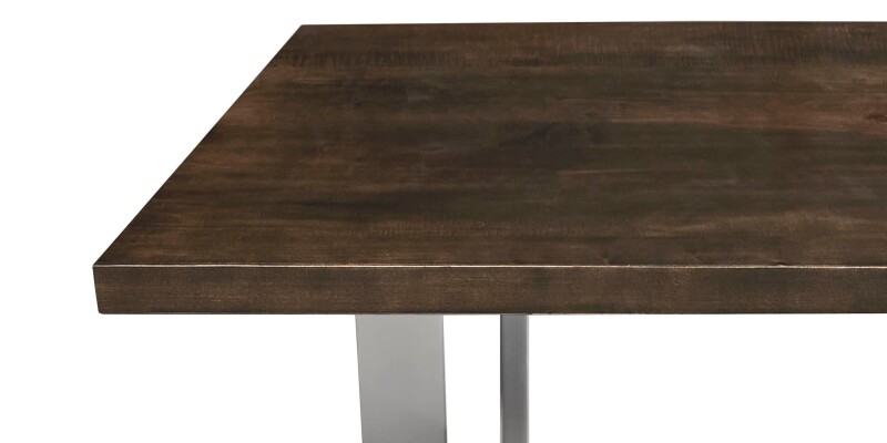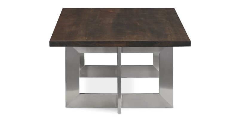 Hand-crafted cocktail table pairing a solid American maple top with a brushed stainless metal base and levelers for even placement. 52 in. W x 30 in. D x 17 in. H.