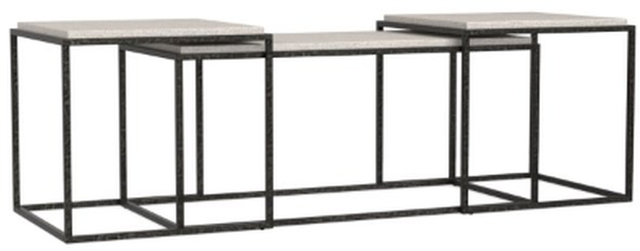 The frame is made of antique metal truss tubing, and the table tops are concrete composite panels. Counterbalancing the sturdiness of the materials is a fresh, geometric design, giving the piece an elegant-yet-casual effect.
