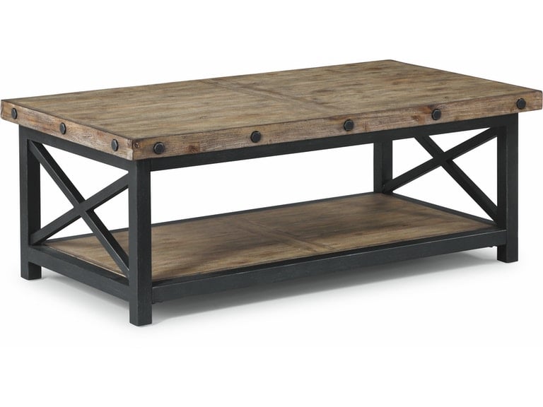 Add character and utility to your living room with the Carpenter rectangular coffee table, which offers casual rustic style with industrial touches. A roomy acacia wood top surface and open lower shelf provide the perfect spot for reading materials and remotes when relaxing or for beverages and snacks while entertaining. Inviting design details include distressed wood planks for a reclaimed look, hand-worked metal frames and exposed bolt heads that are finished to resemble aged, oiled steel. Available in either a brown or light brown finish, this table is designed to complement any living space.