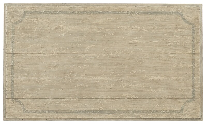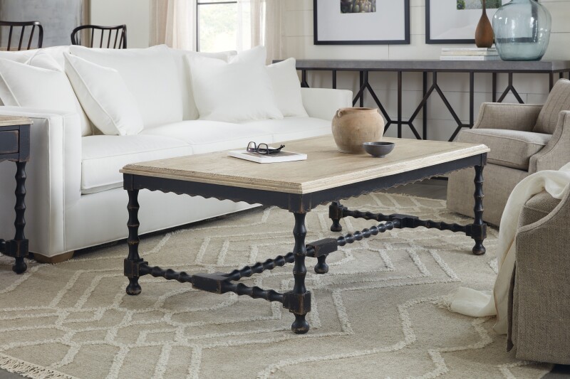 Elegant vintage turned spindle legs in black contrast with a Flaky White-finished top for a look that is farmhouse fresh and inviting. The practical rectangle shape makes this table livable and functional. Crafted of Poplar and Hardwood Solids with Maple Veneers.