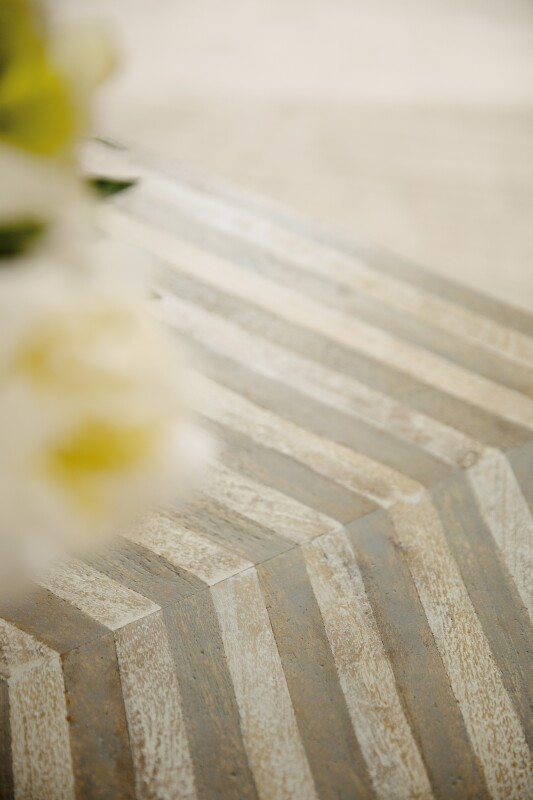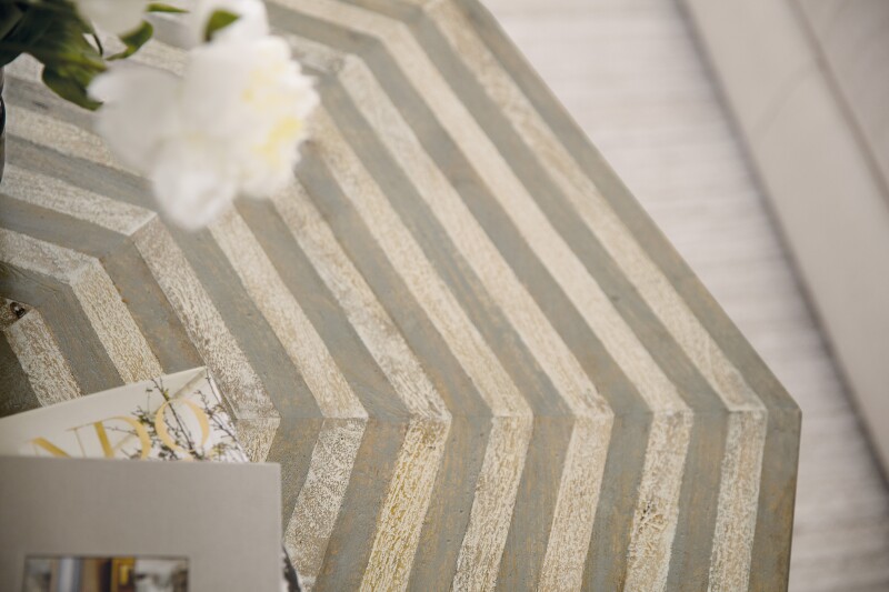 Offering a modern silhouette in a classic pattern, the Commerce & Market Cocktail Table has an octagonal shape, plinth base and a striped design using contrasting neutral-colored finishes. Crafted of Mango Wood, the table has a light wood finish and is on casters for easy mobility.
