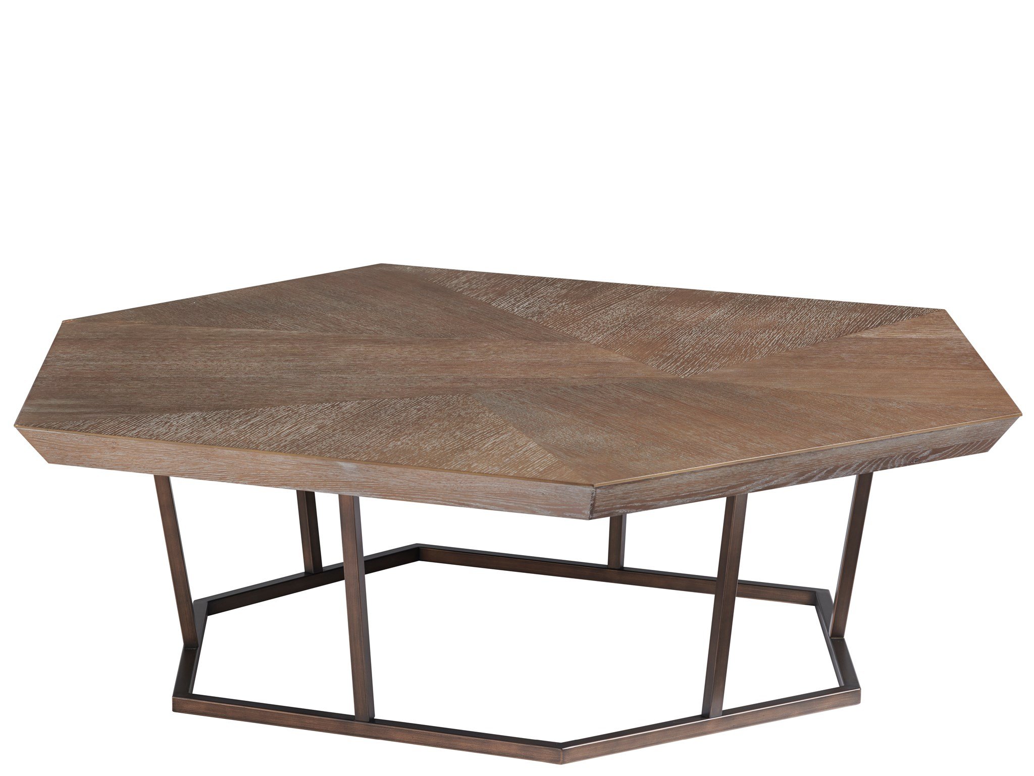A wooden hexagonal top mirrors a matte metal hexagonal base in the Divergence Cocktail Table, blended together to create a fascinating balance of clean, linear angles.