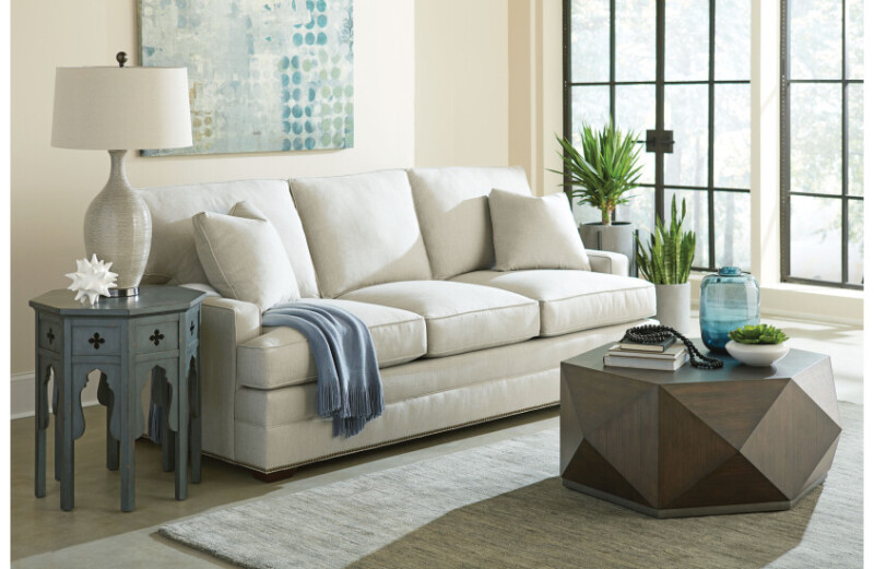 Hex coffee table has dimension, style and a lot of look with the white oak veneers and casters used to make it stand on its own.