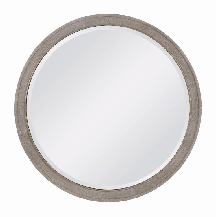 Our Kendall series reflects today’s casual contemporary lifestyle. Its understated, clean line forms, linear oak grain and soft gray finish offer a calming and welcoming vibe. The Kendall Round Coffee Table features lightly wire brushed oak solids and veneers finished in a warm Camino gray stain, satin gold finished metal trim that surrounds the beveled glass top surface and a plinth base.