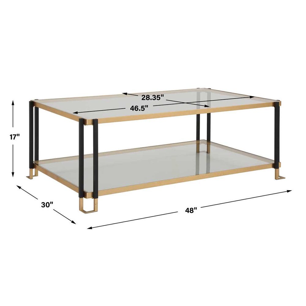 Featuring a clean lined solid iron frame, this contemporary coffee table is finished in a two-toned matte black and gold leaf. Has two tempered glass shelves.