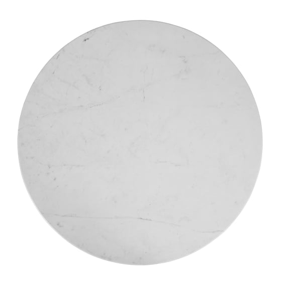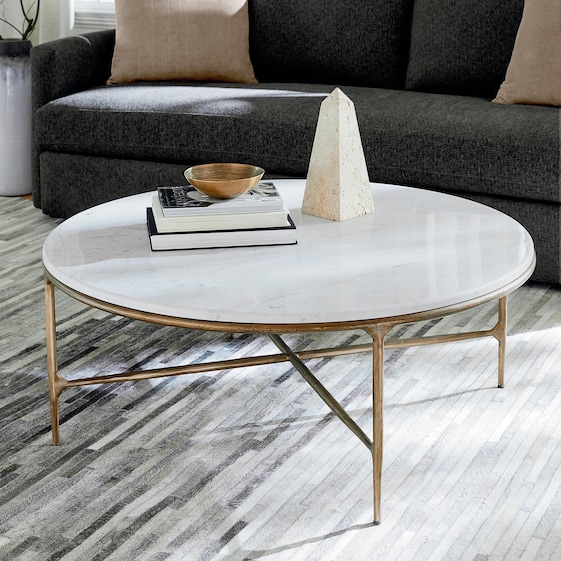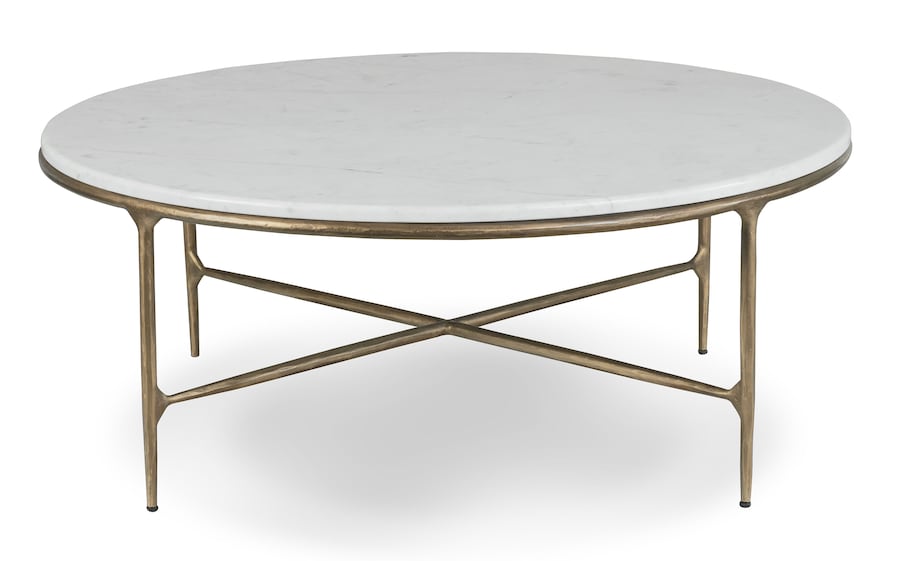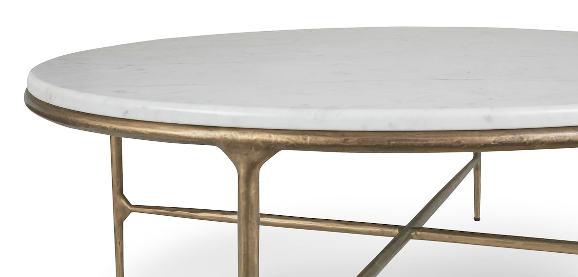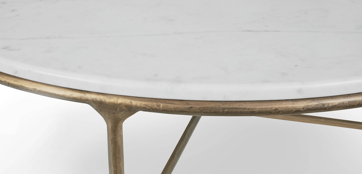 Memories will be made around the Keswick round cocktail table. Its beauty shines in the reflectance of white 7/8” thick Banswara marble and the glint of metallic luxury in the brass finished metal base. Natural streaks of grey, purple, and blush and the hand-distressed brass finish give the table a rustic, down-to-earth sensibility. This highly prized Banswara marble table is sealed for protection, though coasters are still recommended.