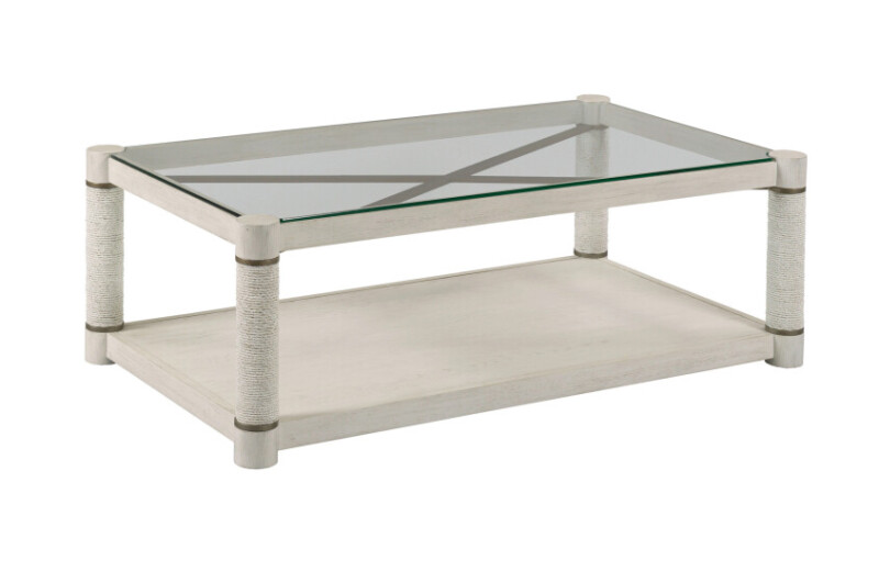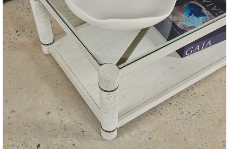 This rectangular coffee table has that casual yet modern feel you are looking for. Beautifully design with raffia wrapped legs and a glass tops that shows off the eye catching metal “X” stretcher design underneath. It comes equipped with one shelf and casters for easy mobility.
