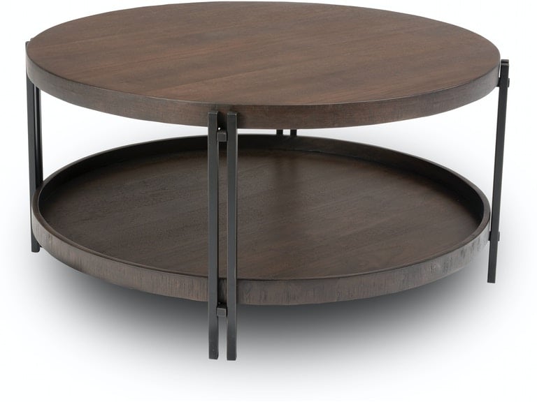 Artisan-crafted details make the Prairie round coffee table a standout design element for living spaces. Rich, dark tone walnut veneers and rough-sawn edge banding complement sleek metal legs in a gunmetal finish for a timeless mixed-media look. The table’s generous surface area offers ample space for books and decor or for beverages and food when entertaining. A lower tray-style shelf provides additional storage space for games and remotes to keep the top clutter-free.