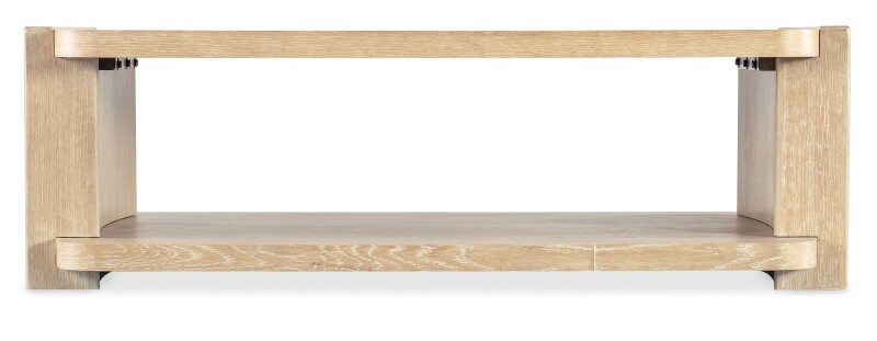 The Retreat Rectangle Cocktail Table has a tranquil personality with a modern twist. Simple, clean lines are in a rectangle shape with rounded corners and interlocking block-style legs. Crafted of Oak Veneers, it is finished in the sand-colored Dune, transparent by design to reveal the unique grain patterns of the wood veneer. One lower fixed shelf.